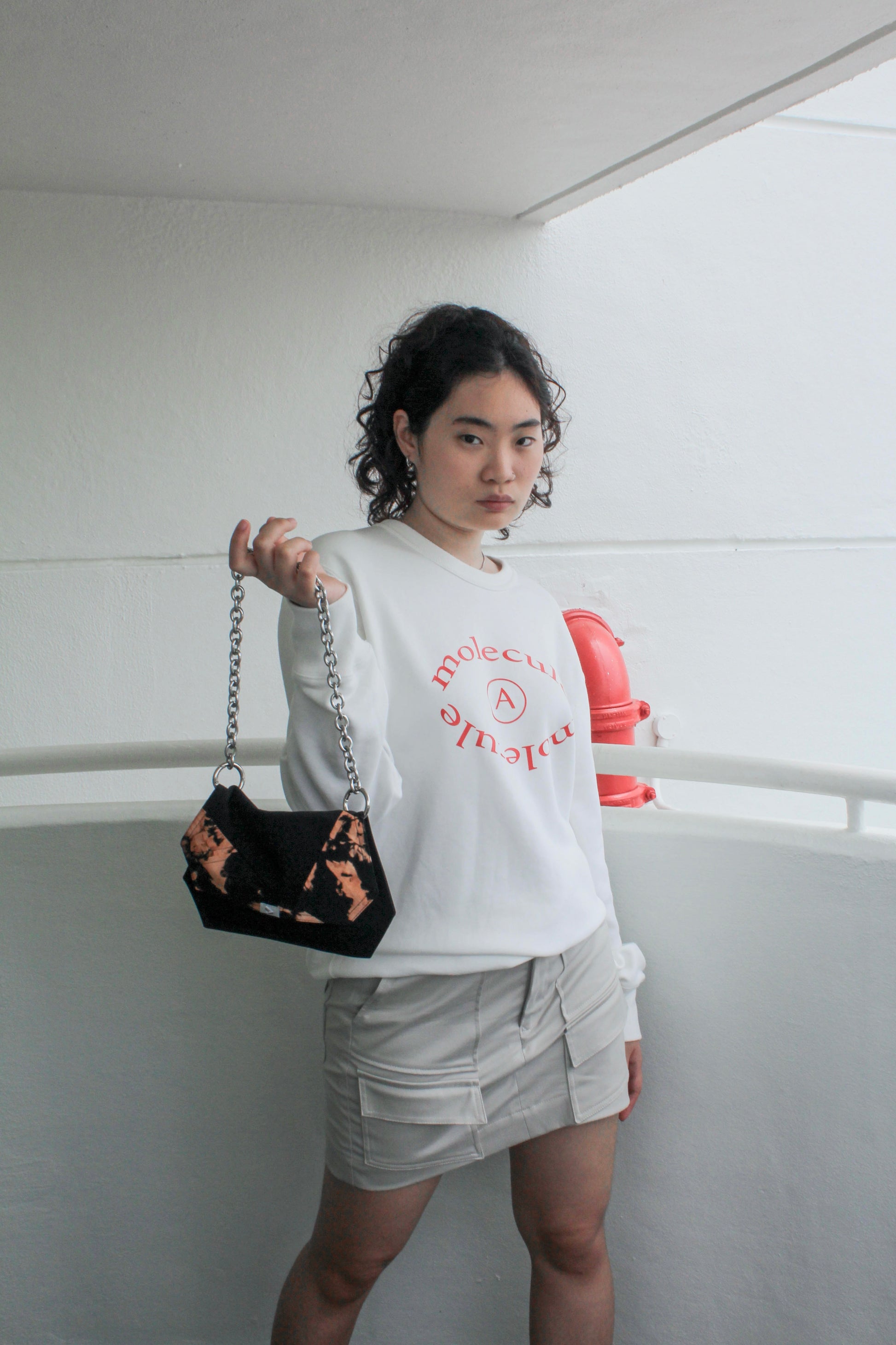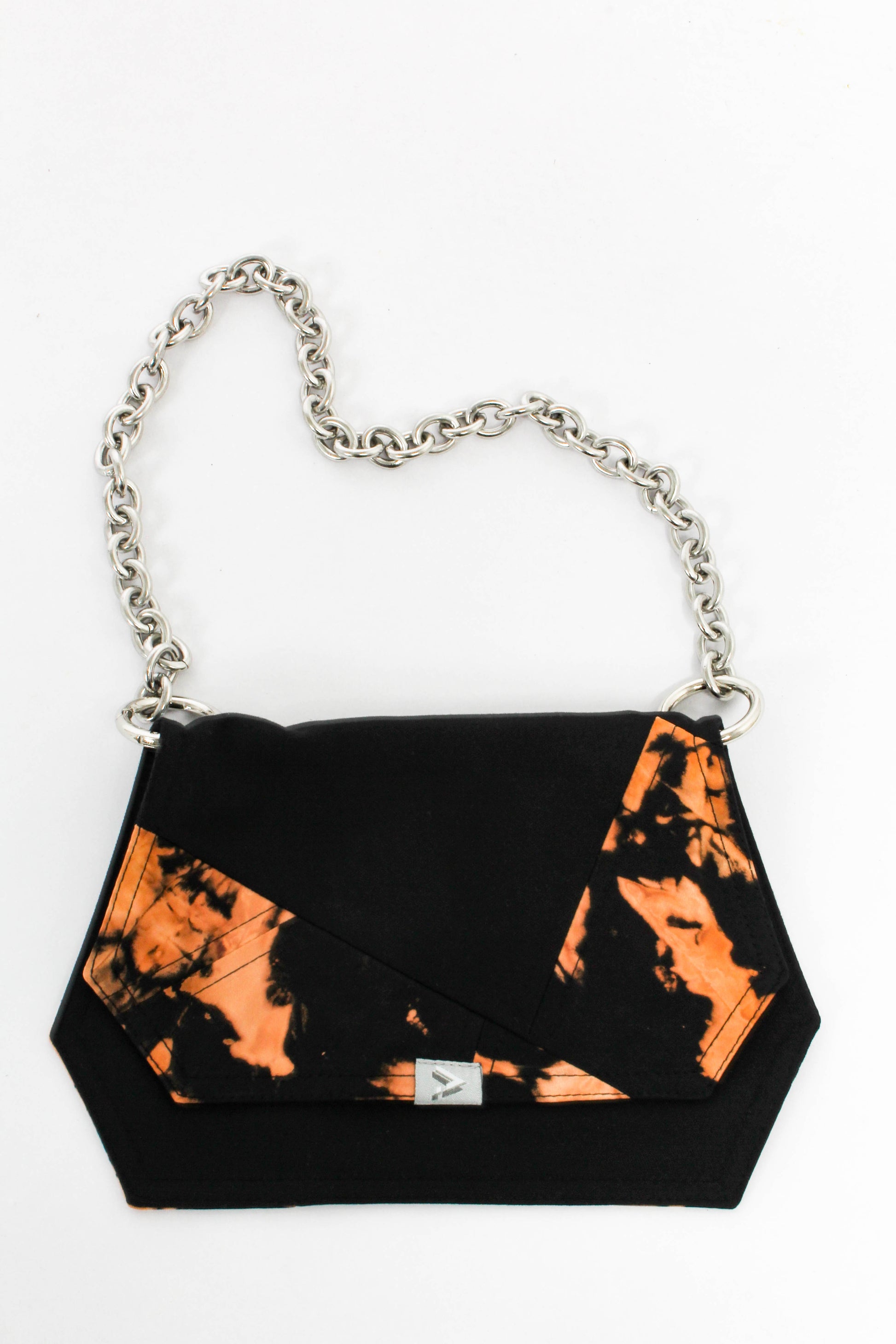 this compact pouch comes with a silver hardware chain for easy carrying.