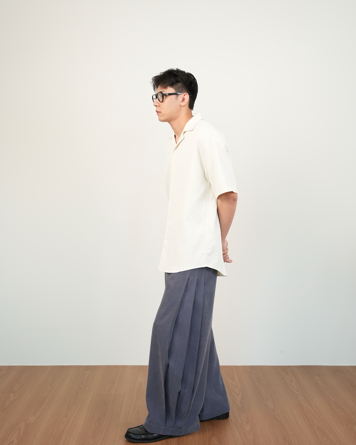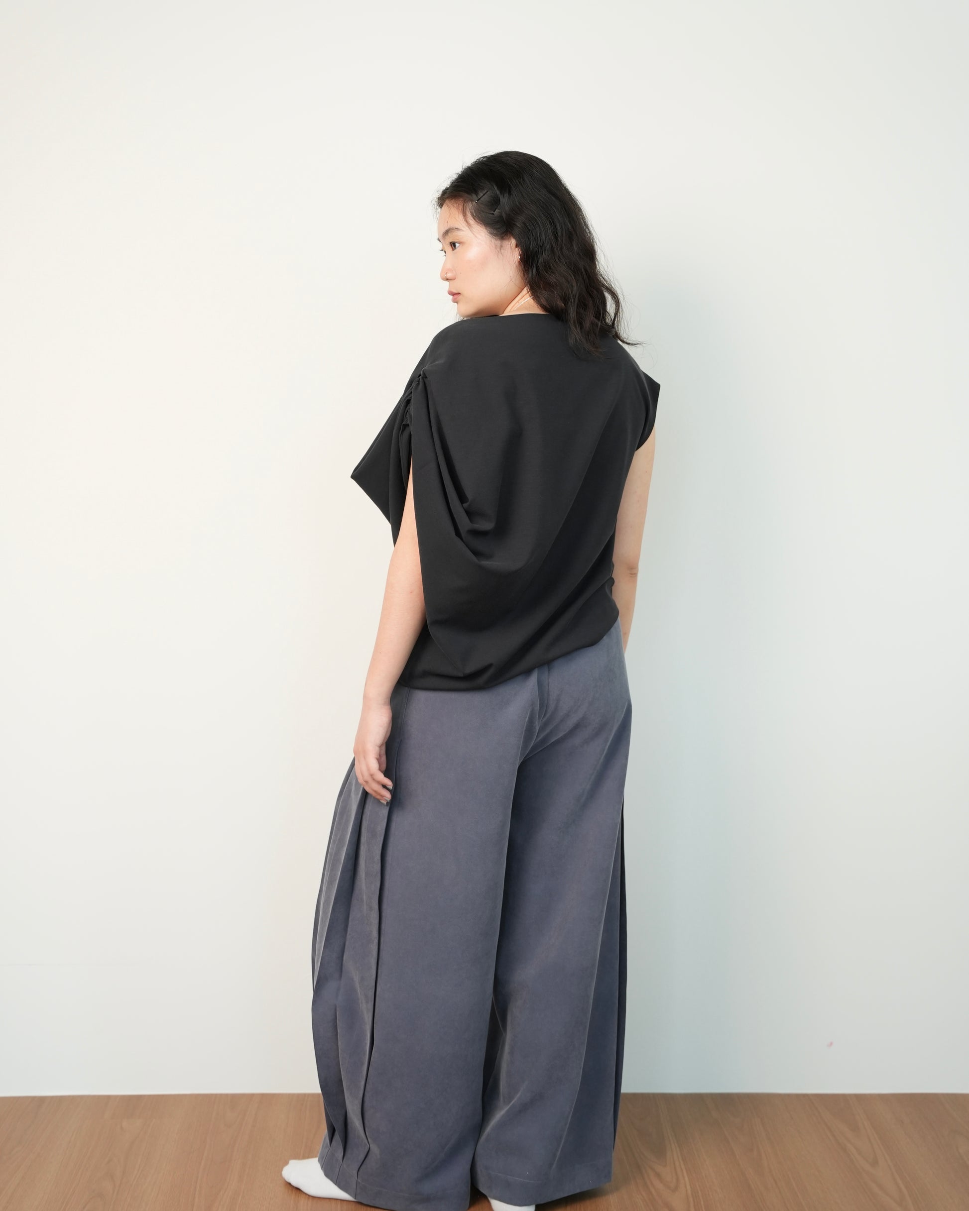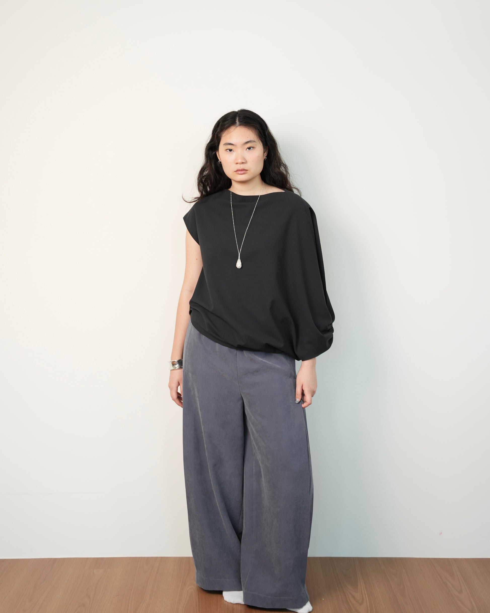 a straight-leg pant with a cocoon pleated silhouette along the side seam — super flattering with subtle textured details throughout.